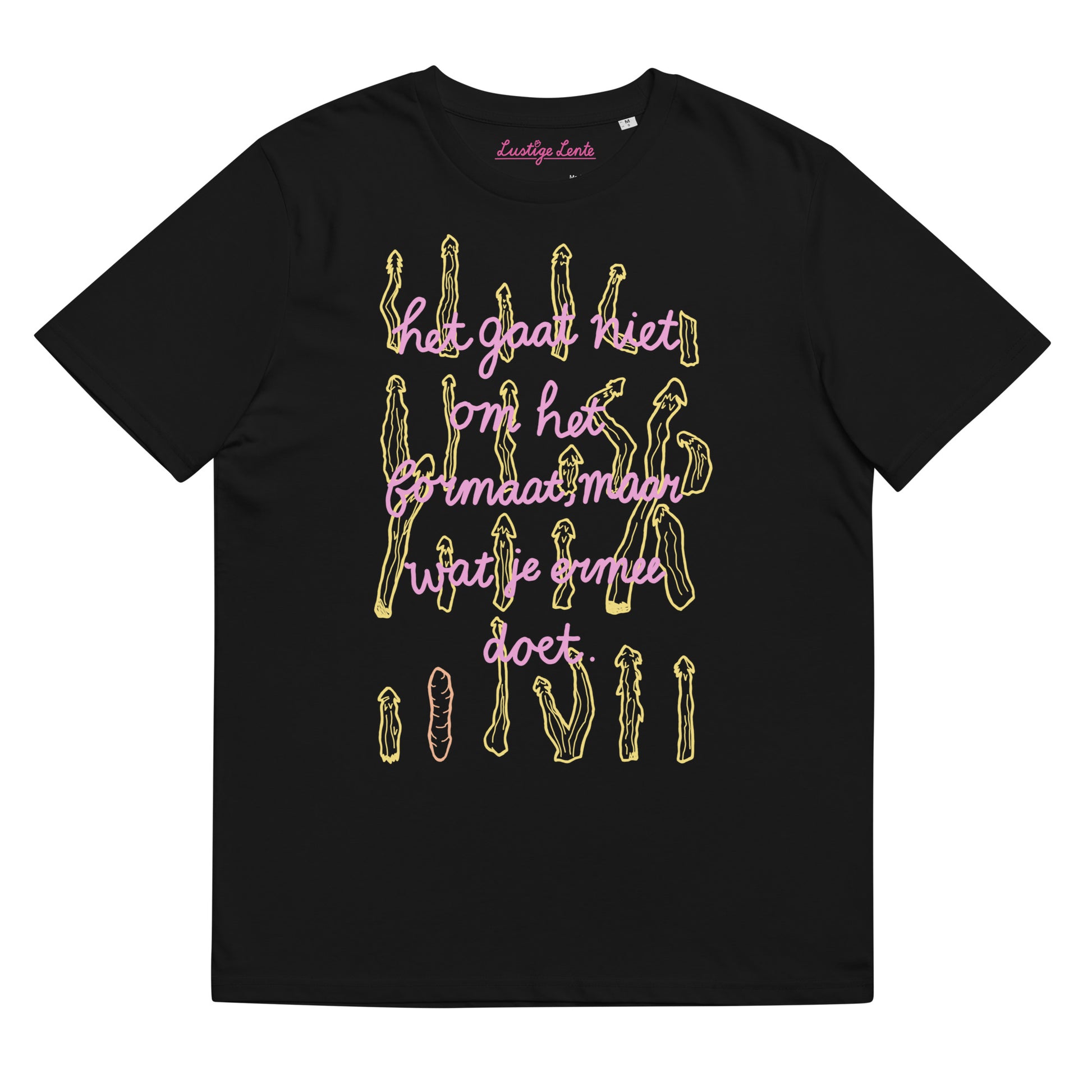 Onzeker zijn over het formaat of de vorm van je asperges is niet nodig. Het gaat immers niet om het formaat, maar om wat je ermee doet. Met dit T-shirt kun jij iedereen laten zien dat het jou niet uitmaakt hoe jouw asperges eruit zien. Dit ontwerp is een Lustige Lente Original, ontworpen als poster in de lente van 2022 als onderdeel van het afstudeerwerk ‘Ik hou van Holland’