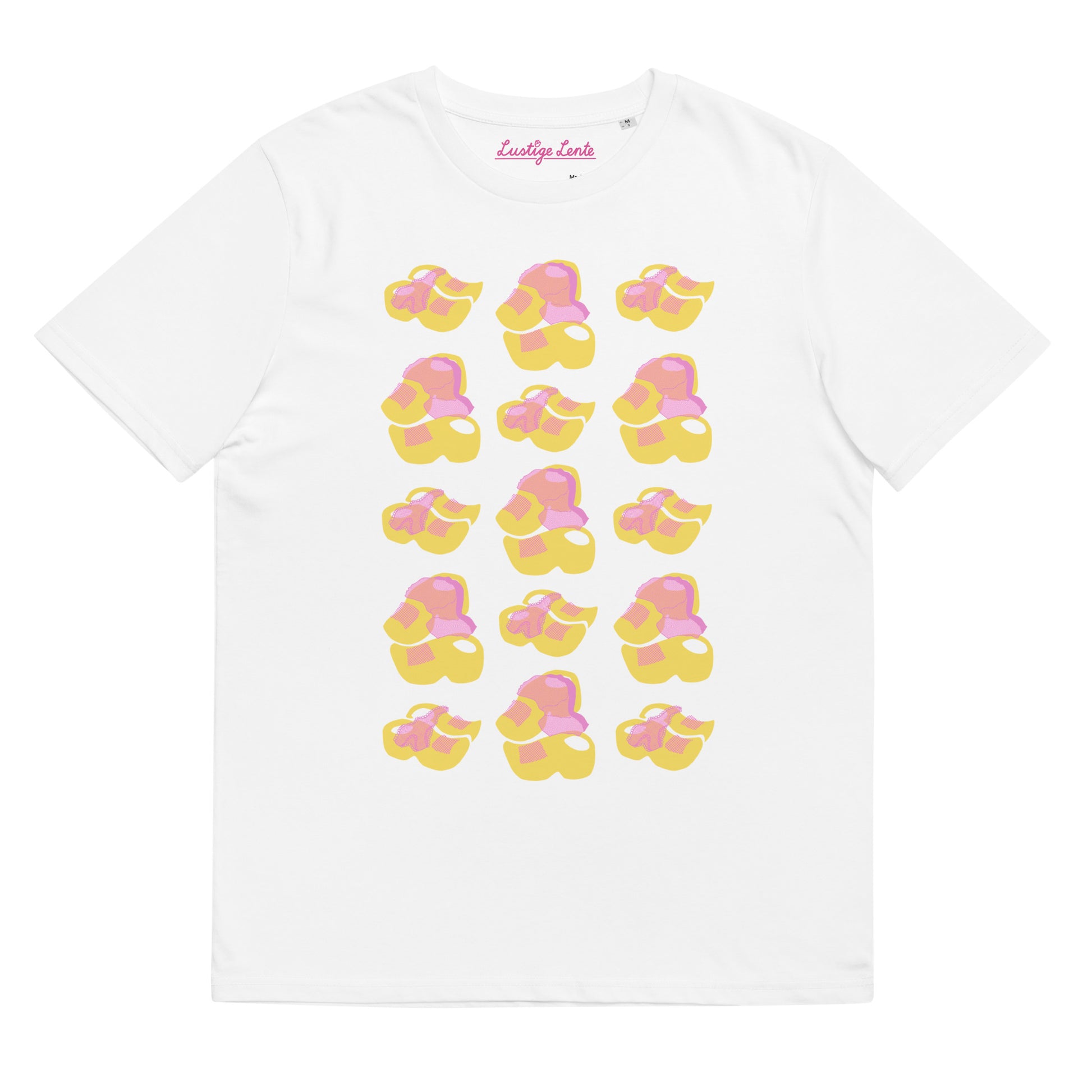 Op het eerste gezicht lijkt het patroon op dit T-shirt op klassieke, onschuldige klompen, maar als je ze dichter bekijkt zie je een uitgetrokken onderbroek over elk paar. Waarvoor hebben de eigenaren van deze klompen nou hun onderbroek uitgedaan? Dit ontwerp is een Lustige Lente Original, ontworpen als poster in de lente van 2022 als onderdeel van het afstudeerwerk ‘Ik hou van Holland’