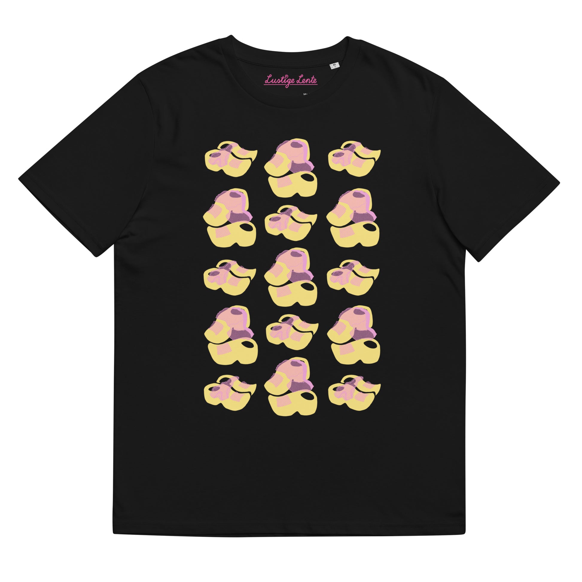 Op het eerste gezicht lijkt het patroon op dit T-shirt op klassieke, onschuldige klompen, maar als je ze dichter bekijkt zie je een uitgetrokken onderbroek over elk paar. Waarvoor hebben de eigenaren van deze klompen nou hun onderbroek uitgedaan? Dit ontwerp is een Lustige Lente Original, ontworpen als poster in de lente van 2022 als onderdeel van het afstudeerwerk ‘Ik hou van Holland’